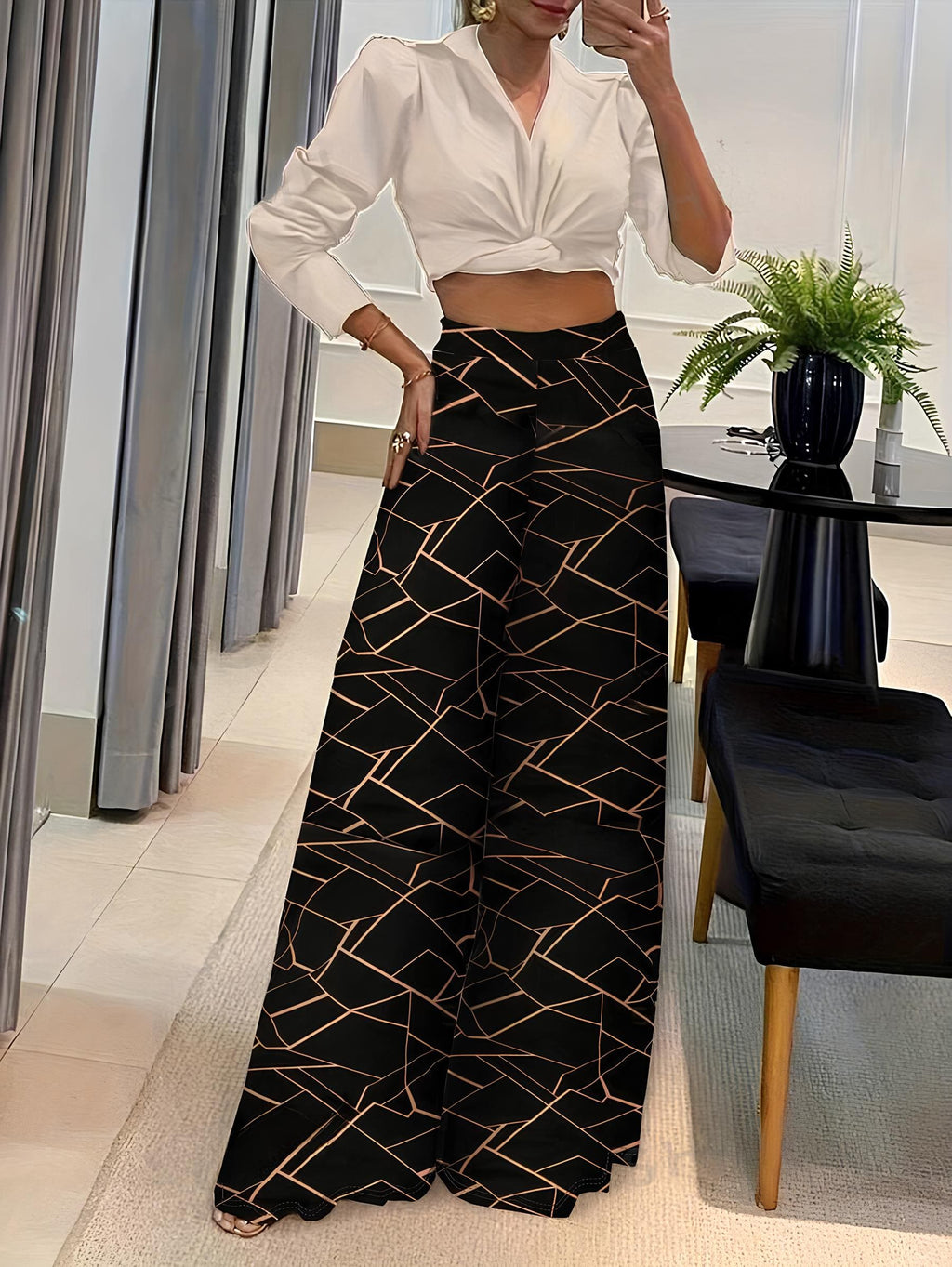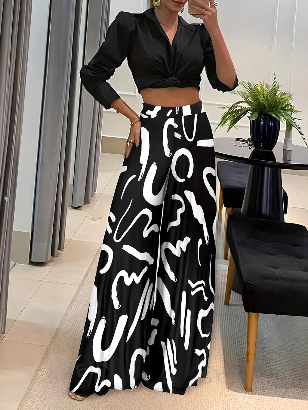 Vista-se com estilo e conforto com a Calça Pantalona Estampada. Seu corte moderno e elegante combina com qualquer ocasião, enquanto o elástico na cintura oferece um ajuste perfeito ao seu corpo.