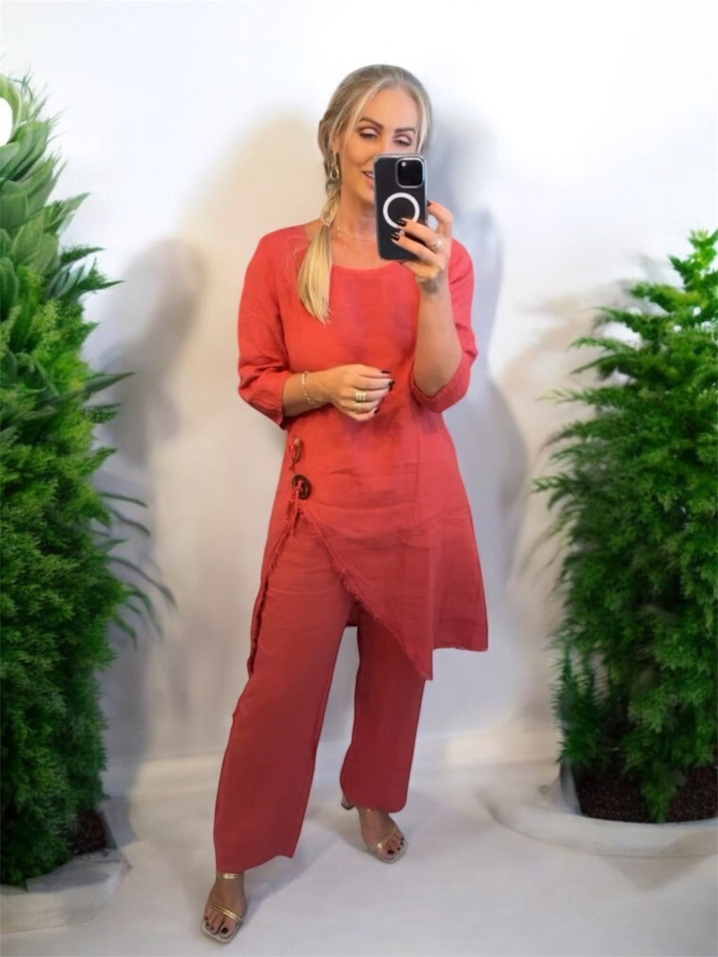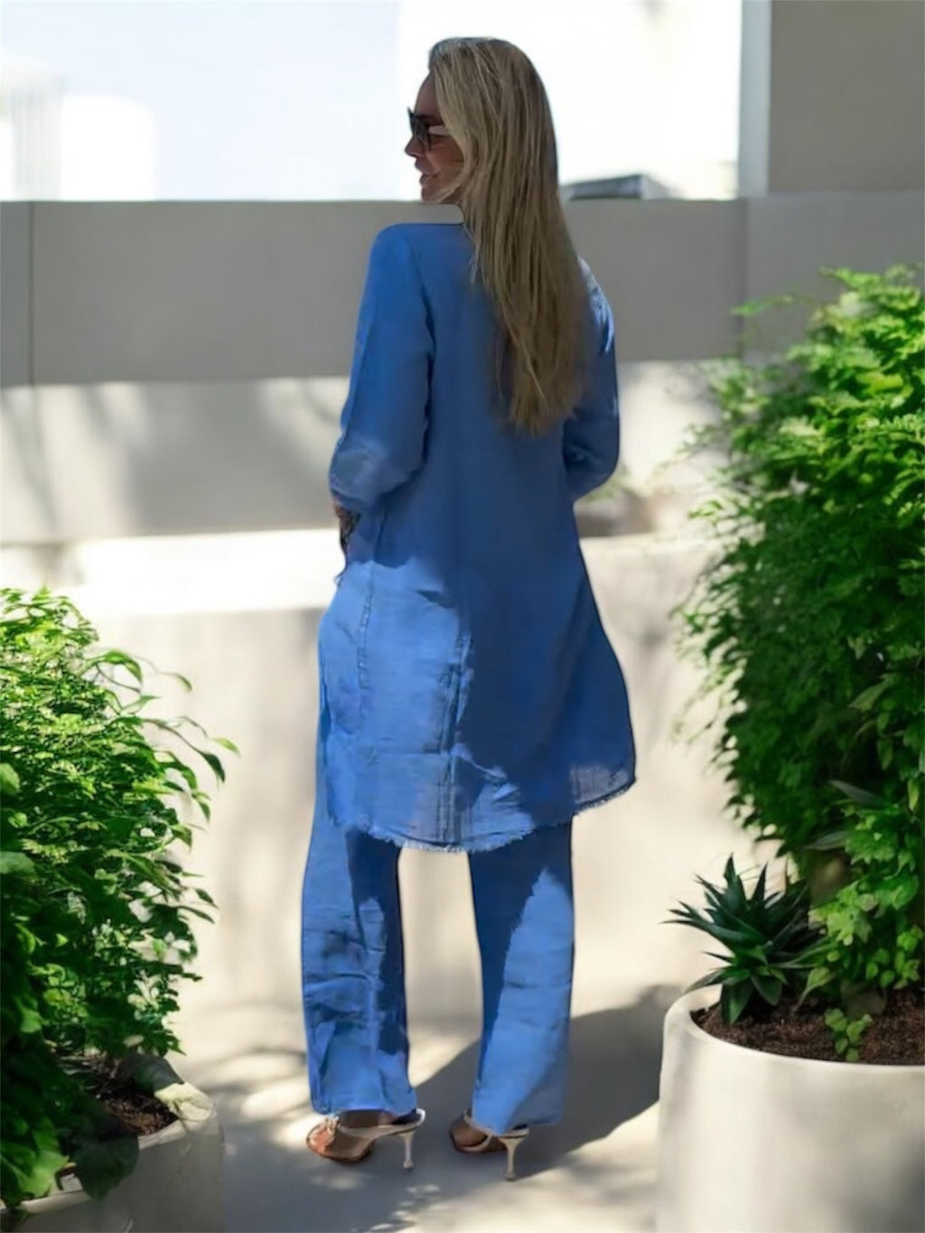 Descubra a elegância atemporal com o nosso exclusivo Conjunto de Blusa e Calça Vivienne em Linho 100% italiano. Este conjunto exala sofisticação e oferece um conforto inigualável, ideal para ocasiões que exigem um toque de classe.